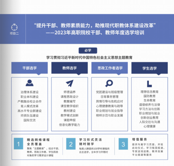 本次网络培训由开云手机web版登录入口主办,国家教育行政学院承办,依托中国教育干部网络学院学习平台组织实施。学校与国家教育行政学院共同研究培训方案,立足于学校工作实际和发展需求,组织了“‘提升干部、教师素质能力,助推现代职教体系建设改革’——2023年职业院校干部、教师年度选学培训”“高职学校党建引领下的业务创新发展专题网络培训”“‘高校辅导员就业指导能力提升’主题工作坊”等14项培训项目,培训内容上突出实用性、系统性和针对性,培训形式上充分发挥网络培训优势,通过“云端”聆听专家讲座、畅谈学习感想、提交研修总结等方式,学思用贯通、知信行统一,使培训真正落到实处,助推学校教育教学工作迈上新台阶。