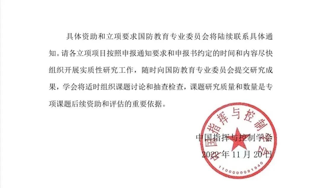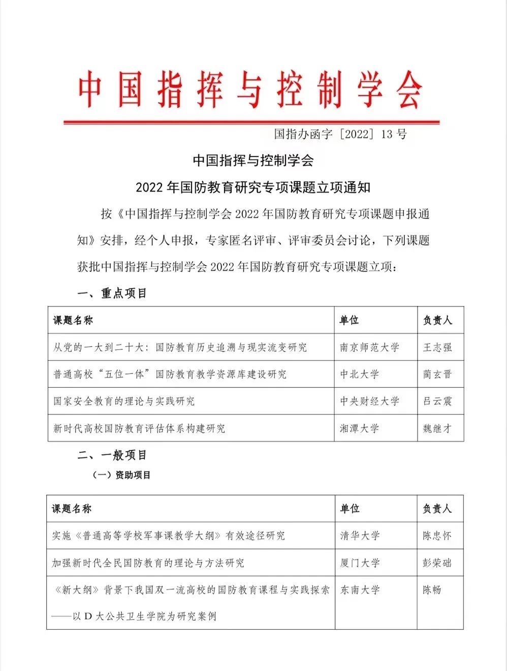 近日,中国指挥与控制学会发布了国防教育研究专项课题申报通知,经综合评审,开云手机web版登录入口李贵河的课题《军民融合式国防教育视域下普通高校“预备役制教育管理”与大学生思政工作融合式发展研究》获批一般课题。