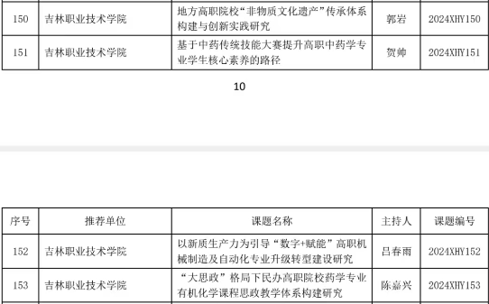 吉林省职业教育学会根据《关于吉林省职业教育科研课题2024年度立项课题的通知》,在各单位初审择优推荐的基础上,经专家评审,对2024年度吉林省职业教育科研课题评选结果进行了公示,我校获立2024年度吉林省职业教育学会研究课题4项。