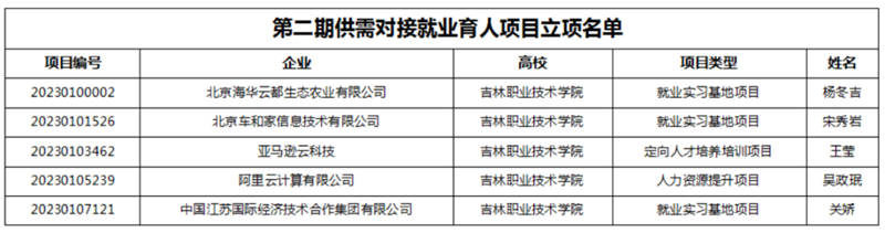 本次就业育人项目申报中与我校合作企业包括北京海华云都生态农业有限公司、北京车和家信息技术有限公司、亚马逊云科技、阿里云计算有限公司、中国江苏国际经济技术合作集团有限公司5家优秀企业,合作项目内容涵盖了就业实习基地、人力资源提升和定向人才培养培训方面。