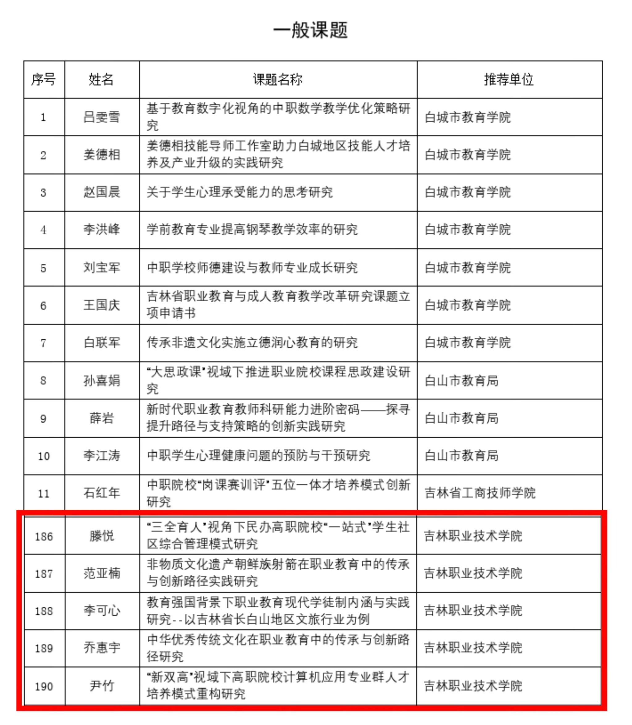 (通讯员 马雪菲)根据《吉林省职业教育与成人教育教学改革研究课题暂行管理办法》(吉教职成字〔2014〕19号),现将2025年度吉林省职业教育与成人教育教学改革研究课题评审结果公示,经过专家评审、学校推荐和省职成处终审,我校共有7项课题获准立项,其中重点课题2项,一般课题5项。