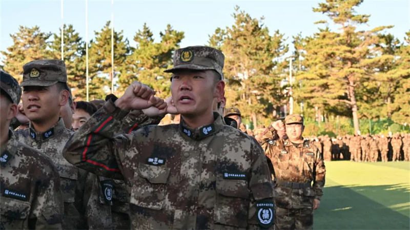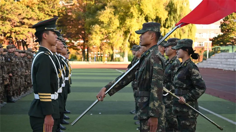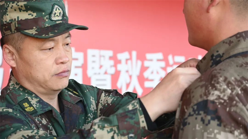 随后,2022级学生代表上台接受领导授衔,运动场上掌声雷动,刚刚佩戴预备役士兵衔的学生们激动之情溢于言表。