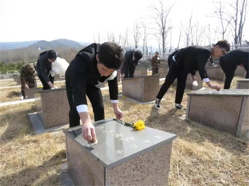 同学们怀着无限敬仰的心情来到烈士墓区擦拭烈士墓碑,以此表达对革命先烈的深深敬意与怀念。
