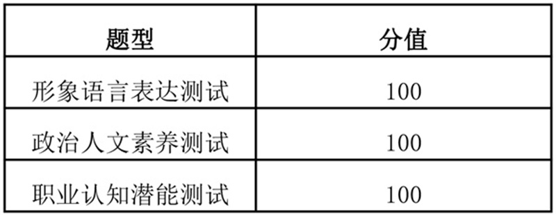 考生面试主要由形象语言表达测试、政治人文素养测试、职业认知潜能测试三项内容组成,每项测试100分,总分300分。
