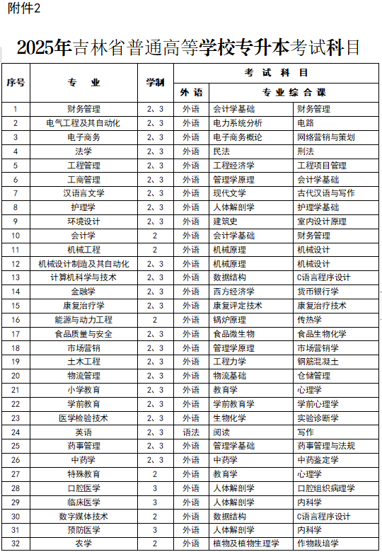 附件2:2025年吉林省普通高等学校专升本考试科目