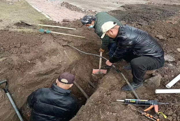 后勤处工作人员不畏严寒,分工协作,根据施工图纸,准确定位挖地沟和铺设下水管道的施工区域,使用挖掘机和铁锹挖掘沟槽,将下水管道安装到沟槽内,再用专业工具将下水管道密封连接,确保连接处不漏水。