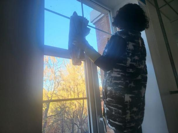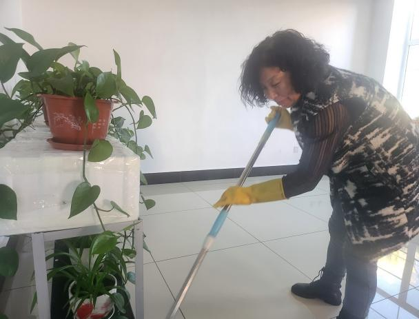 (通讯员 林国娜)杨丽新同志今年五十岁,1972年出生在长春市双阳区。她是后勤处负责行政楼的门卫和保洁人员。在她接手负责行政楼区域后,针对一些现存的保洁难题,她琢磨出了一套自己的独有方法和窍门。每天清晨6点左右,杨丽新同志起床对楼内进行保洁,在无人的情况下把楼道的地面拖洗干净,待到教师们上班后干净且无水的地面呈现在大家眼前,避免了地面湿滑的安全隐患。针对地面脏污严重的问题,杨丽新先将地面打湿,再用带清洁剂的拖把拖一遍,最后再用干净的潮拖把拖一遍,经过反复擦洗的地面光亮整洁,不沾微尘。