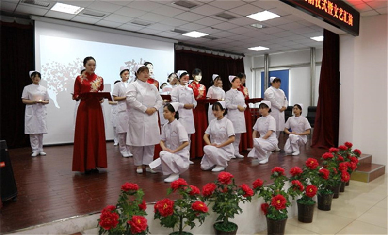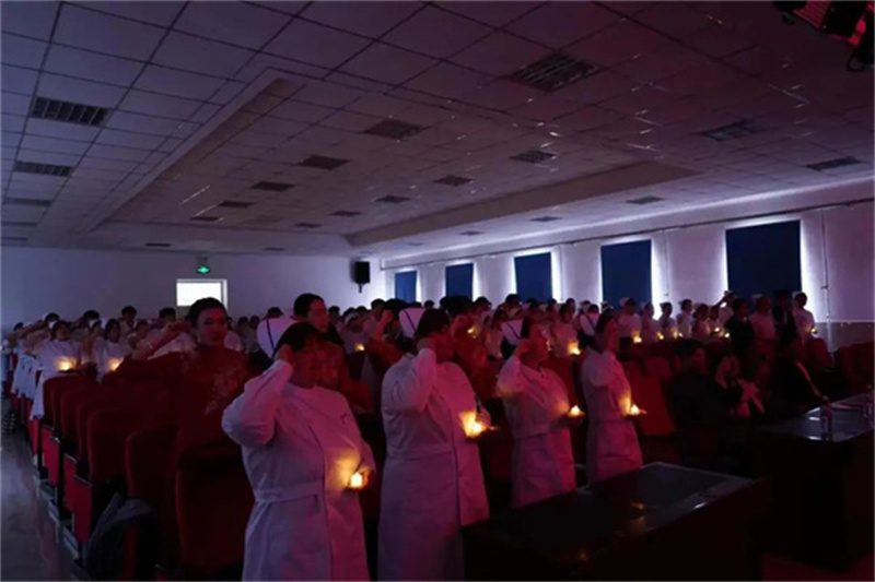 仪式上,学生身着洁白的燕尾服,佩戴护士帽,神情专注,目光炯炯,4位护理专业教师为学生授帽并传递南丁格尔的生命之灯。戴上圣洁的燕帽,接过前辈手中的蜡烛,以爱的名义坚守使命和责任,永远信守尊重生命,保障健康的铿锵誓言。在这神圣的时刻全体师生举起右拳,庄严宣誓,铮铮誓言表达了不辱白衣天使神圣使命的决心。随后举行的文艺汇演中,护理专业同学们用自己的方式诠释了“5.12国际护士节”的真谛,现场氛围十分热烈。