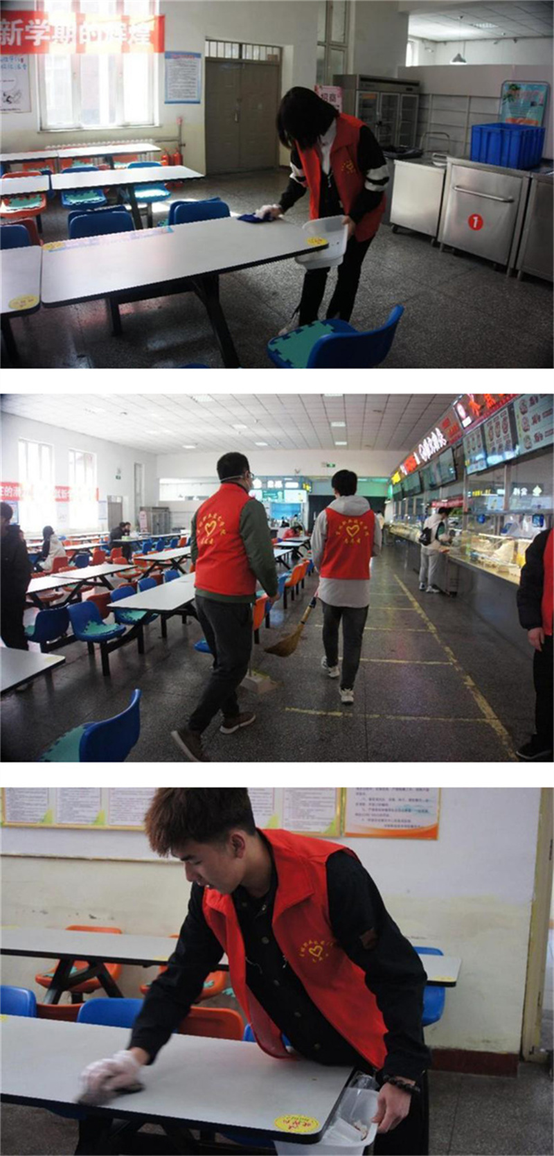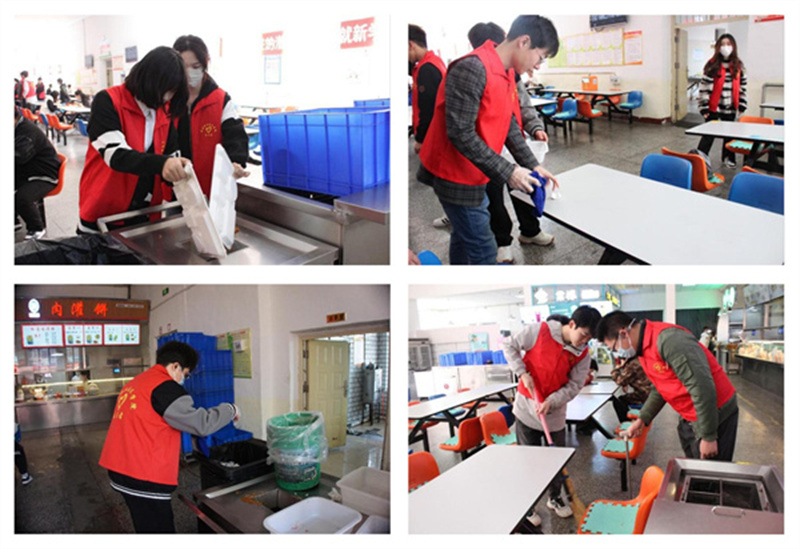 活动伊始,同学们在餐饮中心门口集合,有序领取志愿红马甲,根据餐厅管理人员分工进入不同岗位。在食堂工作人员的热情帮助下,志愿者井然有序、干劲十足,积极融入日常就餐的各项工作中。