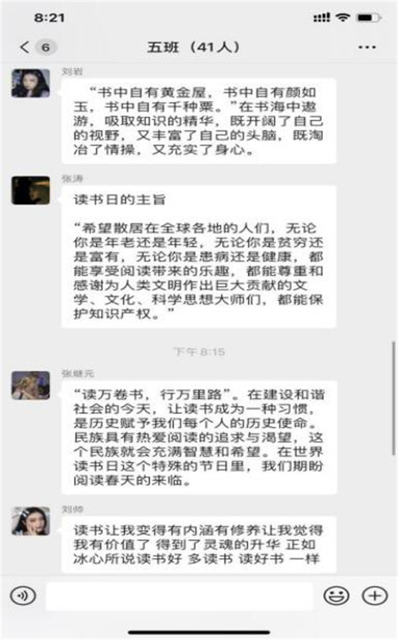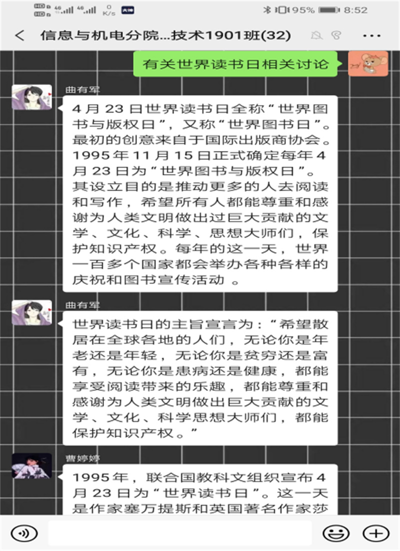 同学们纷纷表示,虽然“世界读书日只有一天,但是它的意义是使每一天成为读书日,它提醒我们养成天天读书的好习惯,丰富个人生活,提高个人素养。