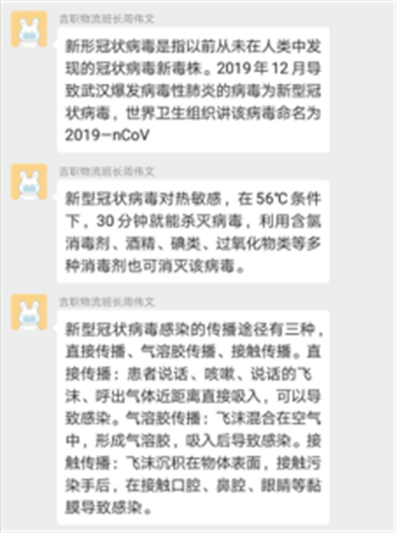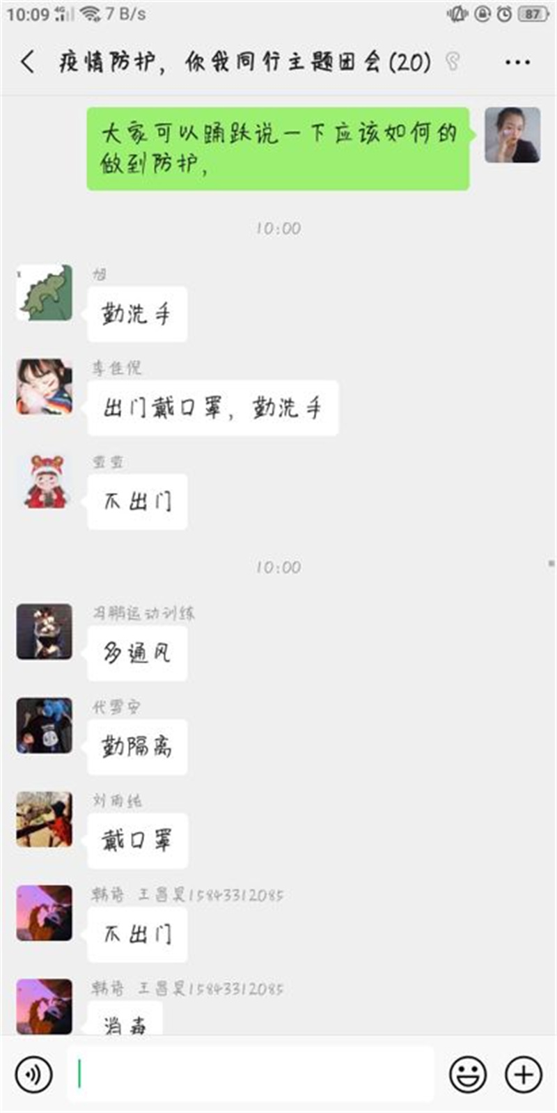 主题团会充分利用现代信息技术,采取了线上互动,由各班团支部书记主持。会议开始,各团支部书记带领大家学习新冠肺炎及有关防疫知识,传达当前全国抗疫工作形势,而后共同学习了《坚持党的领导,全团动员,在防控疫情阻击战中充分发挥共青团生力军和突击队作用的通知》精神。会后,团员们纷纷表示,通过本次团会,更加明确了要承担当代共青团员使命,发挥模范带头作用,坚定信念,团结一心,坚决执行国家、学院的各项防疫措施,自觉配合做好疫情防控工作,与全国人民手拉手,肩并肩,闯过难关,坚决打赢这场疫情防控阻击战!