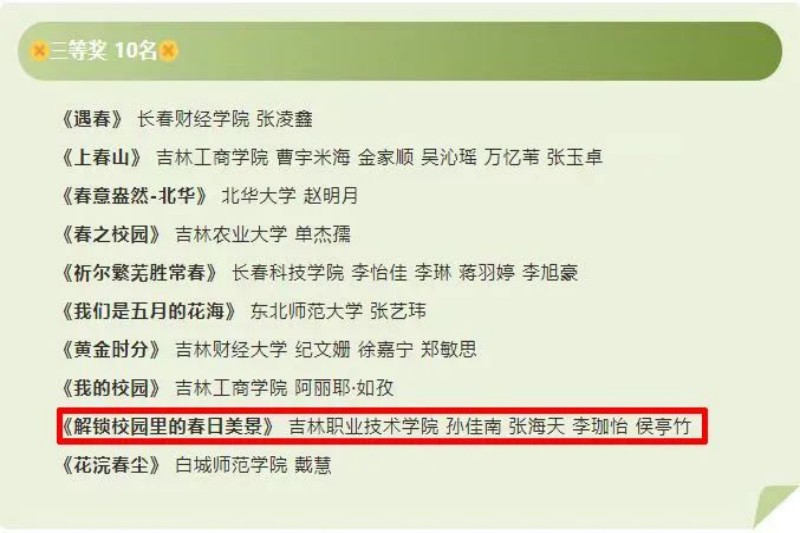 (记者 杨晓明)由吉林日报社主办,“学习强国”吉林学习平台编辑部、吉林省高校网络思政工作中心(“学习强国”吉林高校网络育人基地)、吉林日报彩练新闻科教卫频道、吉林日报全媒体运营部承办的“‘春之美丽校园’吉林省大学生短视频大赛”评审结果正式出炉。经过7位专业评审嘉宾的现场评审,最终评选出一等奖1名,二等奖2名,三等奖10名,优秀奖30名。我校大学生记者团孙佳南、张海天、李珈怡、侯亭竹4名同学报送的短视频《解锁校园里的春日美景》在全省48所院校组织的823篇大学生参赛作品中脱颖而出,喜获三等奖证书及奖金1000元。