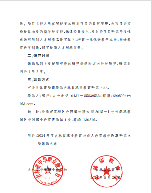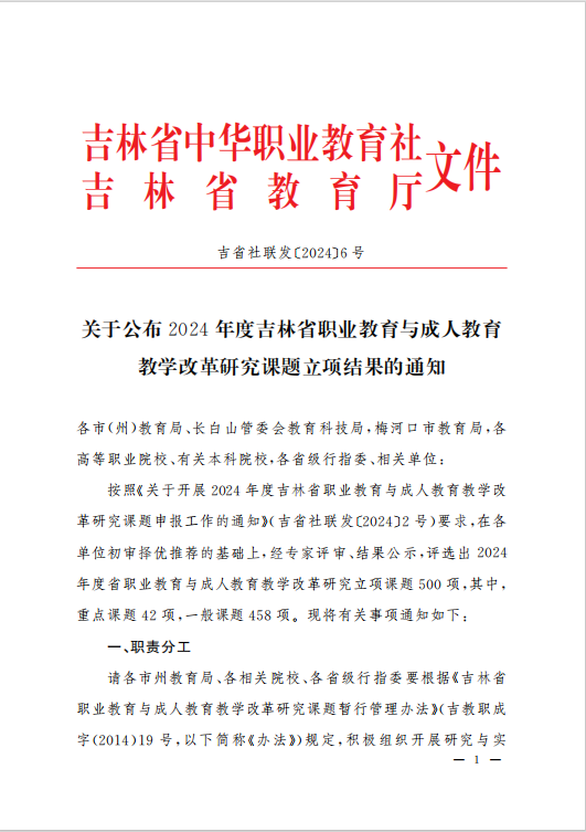 (通讯员 马雪菲)根据《关于开展 2024年度吉林省职业教育与成人教育教学改革研究课题申报工作的通知》(吉省社联发〔2024〕2号)要求,在各单位初审择优推荐的基础上,经专家评审、结果公示,评选出2024年度省职业教育与成人教育教学改革研究立项课题。