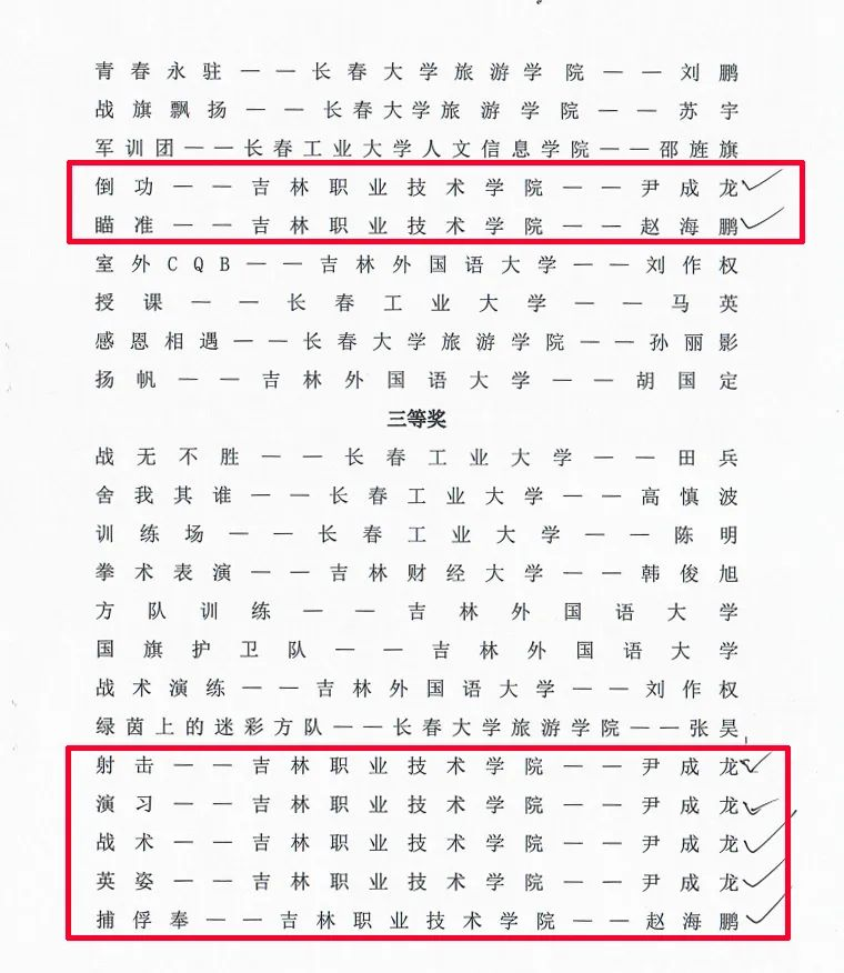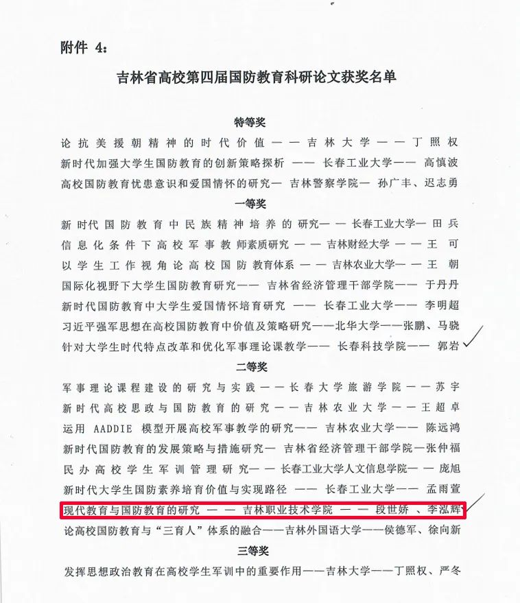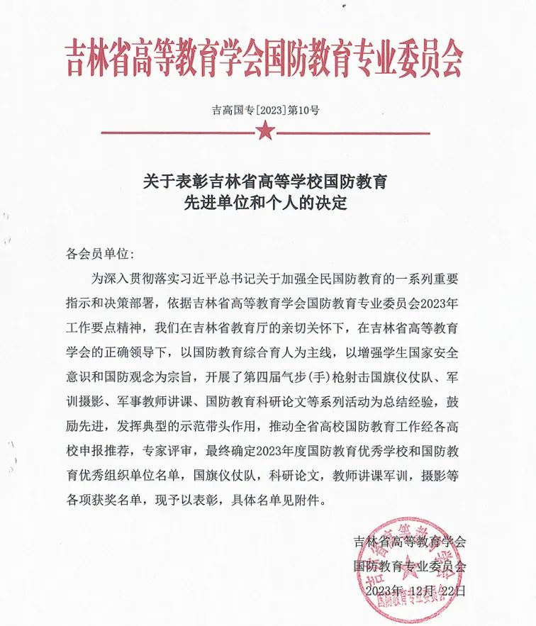 (记者 杨晓明)近日,2023年度吉林省普通高等学校国防教育工作先进单位和先进个人评选活动结果公布,我校荣获吉林省高校2023年度国防教育活动优秀组织单位,段世娇、李泓辉获得吉林省高校第四届国防教育科研论文二等奖。尹成龙获得吉林省高校第四届军训摄影特等奖,赵海鹏获得吉林省高校第四届军训摄影特等奖。