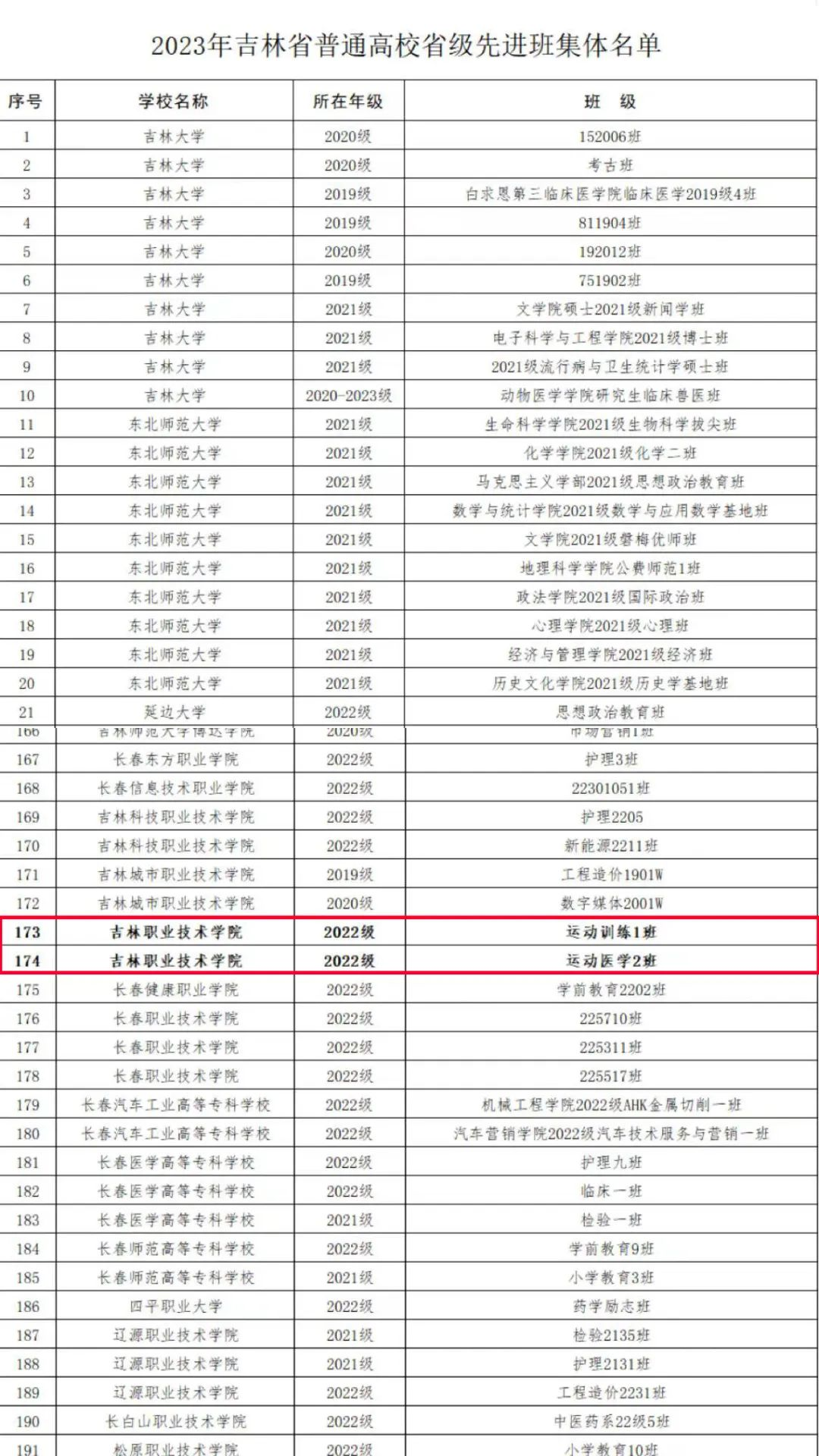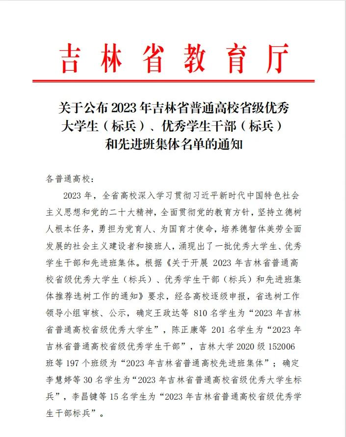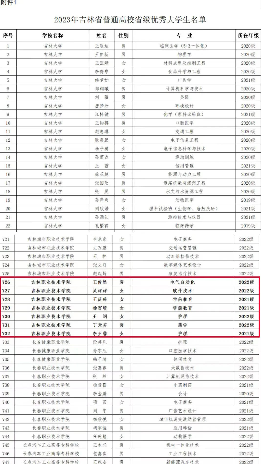(记者 杨晓明)近期,吉林省教育厅发布《关于公布2023年吉林省普通高校省级优秀大学生(标兵)、优秀学生干部(标兵)和先进班集体名单的通知》,我校电气自动化专业王俊皓等7名同学获评“吉林省优秀大学生”,口腔医学技术专业李春磊等2名同学获评“吉林省优秀学生干部”,2022级运动训练1班等2个班级获评“吉林省先进班集体”。