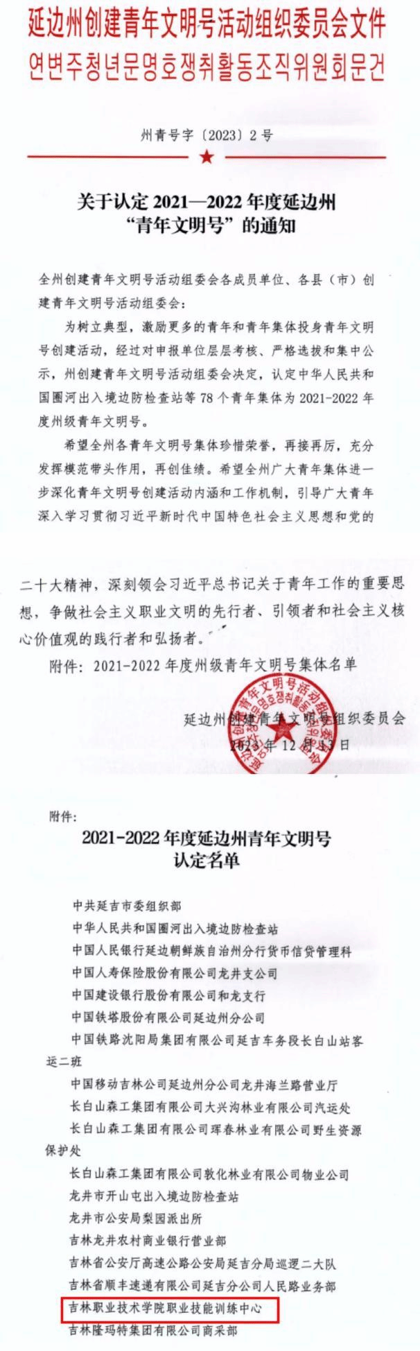 近日,延边州创建青年文明号活动组织委员会印发了《关于认定2021—2022年度延边州“青年文明号”的通知》(州青号字〔2023〕2号),我校职业技能训练中心被延边州创建青年文明号活动组织委员会认定为2021—2022年度延边州“青年文明号”,这是我校首个被认定为州级“青年文明号”的集体。
