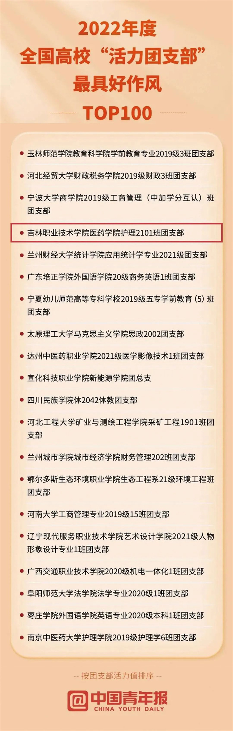 经过组织宣传、校内选树、省级推选、全国展示等环节,我校医药学院护理2101班团支部入围2022年度全国高校“活力团支部”最具好作风TOP100榜。