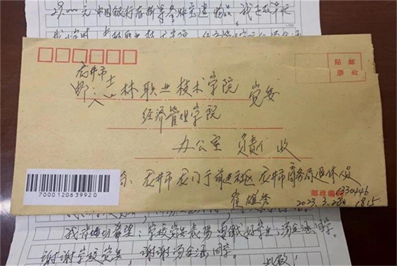 3月28日,我校党委收到一封特别的来信,这是一封致拾金不昧好学生——汤金涵的感谢信。