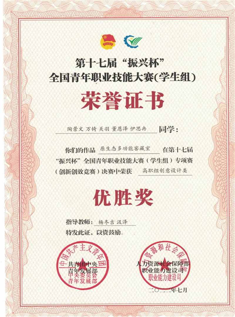 为深入学习贯彻习近平总书记致首届全国职业技能大赛贺信精神,落实省人才工作暨创新型省份建设大会精神,深化推进人才强省战略,帮助青年技能人才搭建学知练技、交流分享平台。我校杨冬吉、汲泽作为“原生态多功能窖藏室”项目指导教师带领万锜等五名同学报名参加由共青团中央、人力资源社会保障部联合举办的第十七届“振兴杯”全国青年职业技能大赛,该项目经过层层选拔最终在决赛中荣获高职组创意设计类优胜奖。