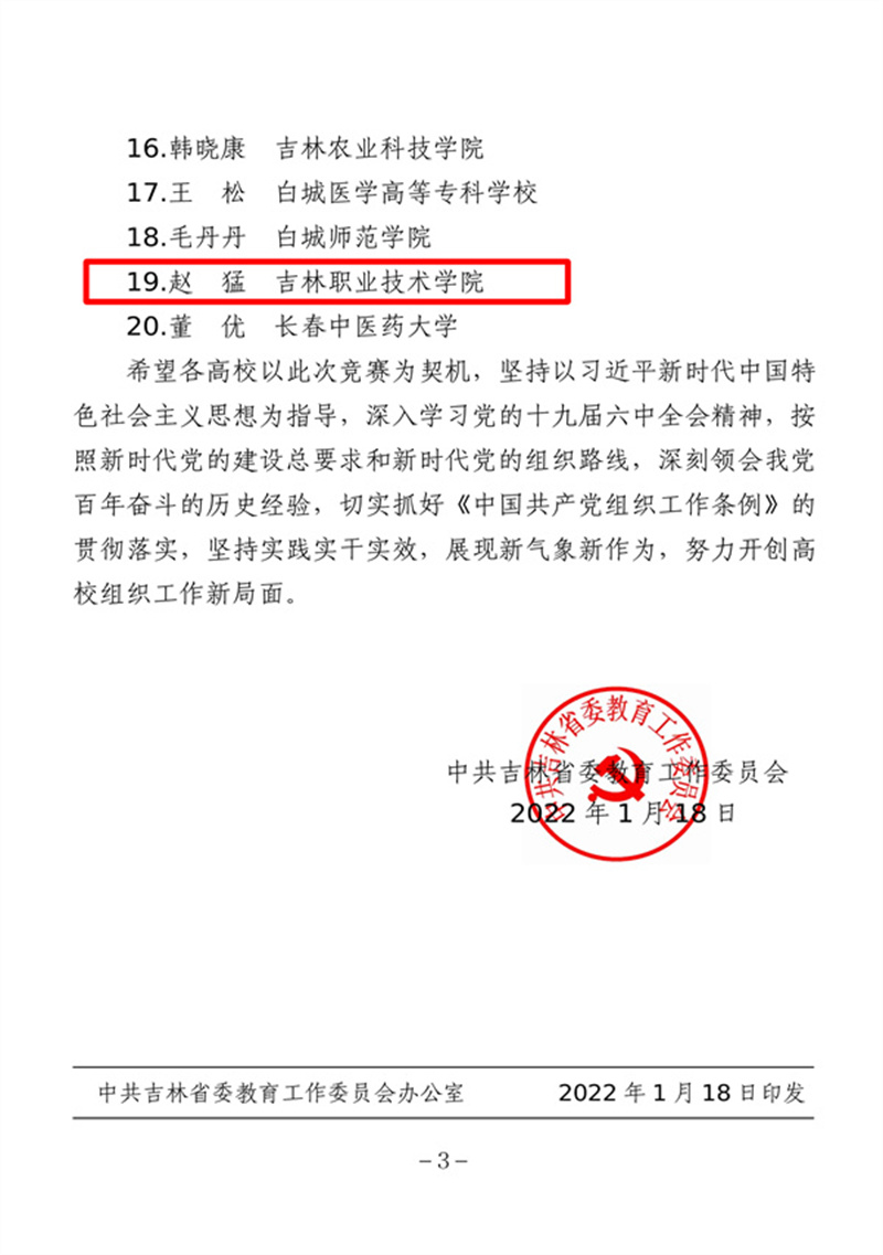 为深入学习贯彻习近平总书记关于党的建设和组织工作重要论述,全面贯彻落实《中国共产党组织工作条例》,根据省委组织部要求,近期省委教育工委组织开展了全省高校组织系统学习贯彻党的十九届六中全会精神 全面落实《中国共产党组织工作条例》知识竞赛。经综合评审,我校教师赵猛荣获“优胜个人”奖项。