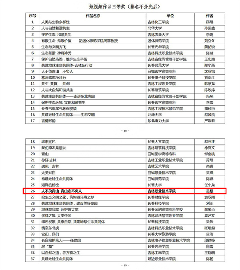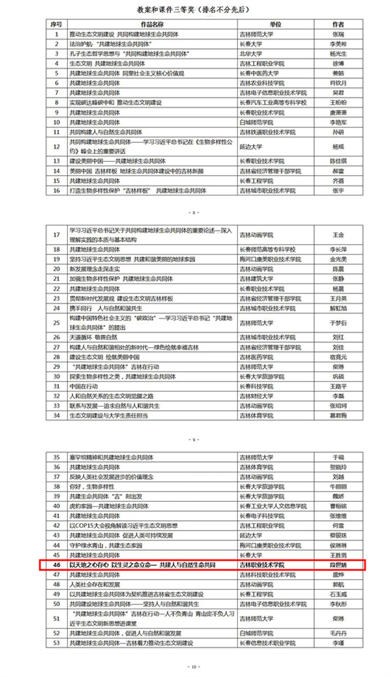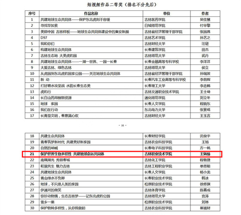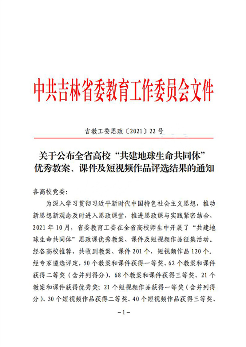为深入学习贯彻习近平新时代中国特色社会主义思想,推动新思想新观念及时进入思政课堂,推进思政课与实践紧密结合,2021年10月,省委教育工委在全省高校师生中开展了“共建地球生命共同体”思政课优秀教案、课件及短视频作品征集活动。经专家遴选评定,我校教师段世娇荣获“教案和课件三等奖”;学生王炳臻荣获“短视频作品二等奖”;教师吴限荣获“短视频作品三等奖”。