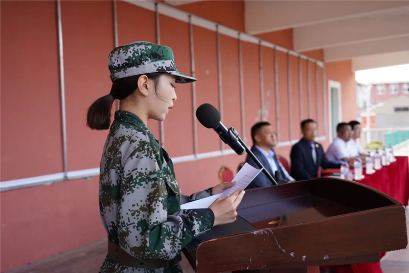 军训教官代表2022级护理三班付熙之同学代表教官发言,学员代表2024级医学检验技术专业黄晶涵同学作表态发言。军训团参谋长吴澥组织全体学员进行军训宣誓。