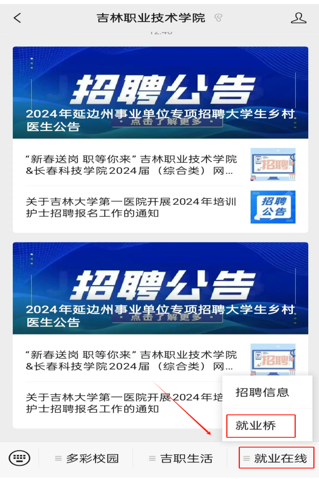(通讯员修丽颖)为了加大力度做好我校毕业生就业服务工作,“开云手机web版登录入口”公众号菜单栏“就业在线”一栏新增“就业桥”板块,方便学院学生及时了解、查询相关就业信息。