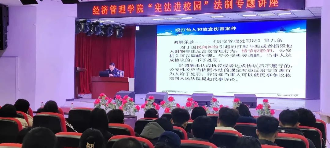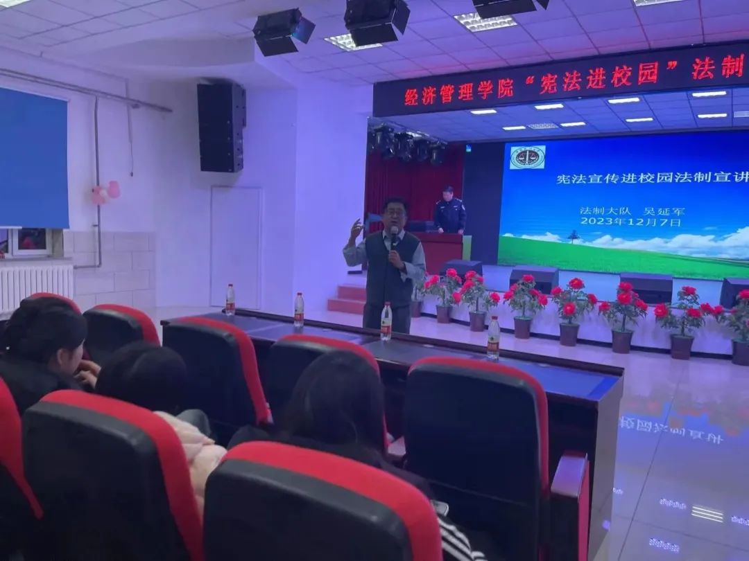 (通讯员 孙畅 唐赫赛)12月1日至7日是2023年全国“宪法宣传周”。为进一步加强宪法宣传,积极进行校园普法,营造尊法、学法、守法、用法的浓厚氛围,12月7日晚,经济管理学院党总支特邀龙井市公安局法制大队警官到校,开展了一次“宪法进校园”法制专题讲座。讲座由经济管理学院党总支书记王泽强主持,法制大队教导员吴延军警官主讲,辅导员、22级、23级同学参加了讲座。