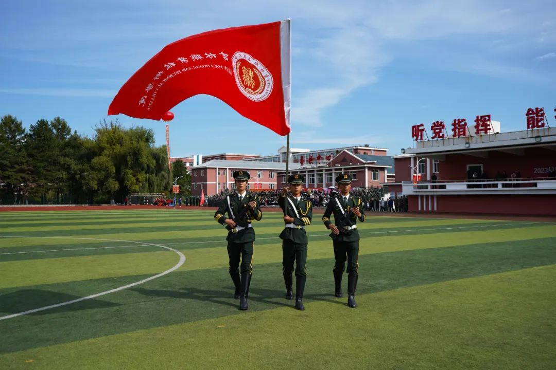“标兵就位”口令声回荡在整个运动场,护旗手们迎面走来,校旗飘扬,在阅兵场上展示着吉职学子优秀的军训成果。