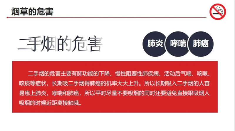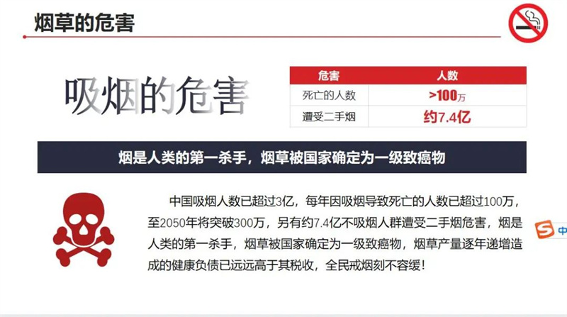 烟草依赖是一种慢性疾病,烟草危害是世界最严重的公共卫生问题之一,吸烟和二手烟问题严重危害人类健康。积极建设"无烟校园”,是创建美好生活校园、文明校园的重要组成部分,是关心师生身心健康和消除校园安全隐患的重要举措。