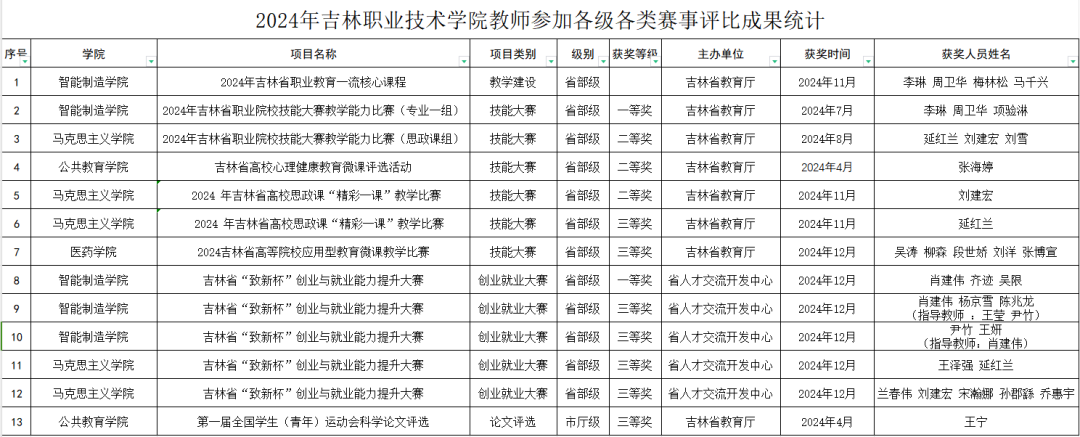 教师队伍佳绩不断,在吉林省职业院校技能大赛教学能力比赛等多个省级赛事中,智能制造学院、马克思主义学院、公共教育学院等学院的教师纷纷获奖,在吉林省“致新杯”大赛中也多次收获荣誉,展现优秀指导能力。
