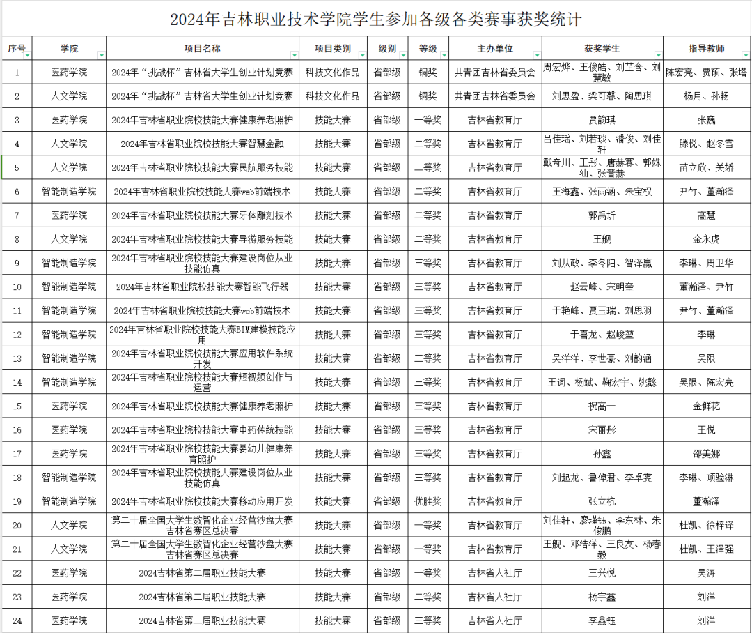 在吉林省职业院校技能大赛诸多项目里,医药学院、人文学院、智能制造学院的学生拿下不同等级奖项,覆盖多领域。人文学院学生团队更是在第四届全国院校民航空中乘务专业技能大赛总决赛获国家级三等奖,在2024年第三届“新道杯”电子商务数智技能大赛全国总决赛也获此殊荣,为学校争得荣誉。