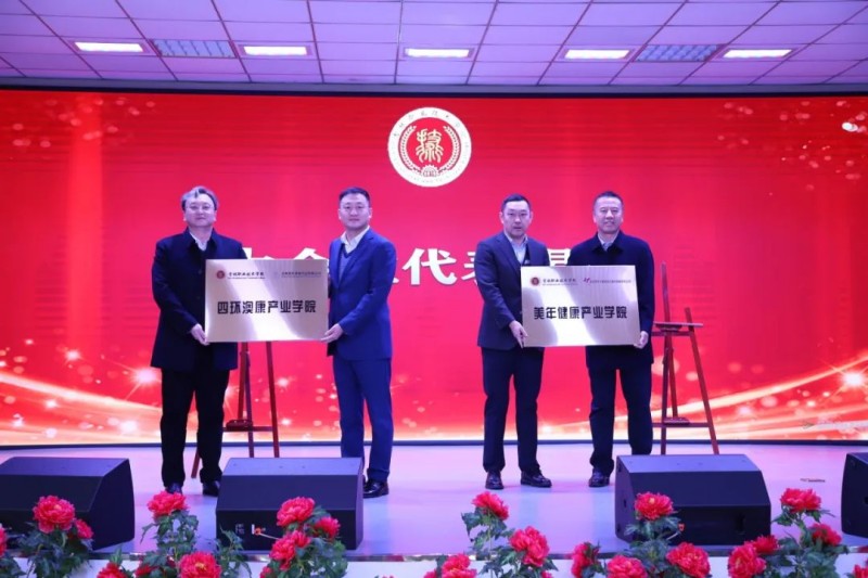 李光星、柳森、吴延臣、于耀程共同为美年健康、四环奥康两个产业学院揭牌,红绸飘落,掌声雷动,象征着学校与企业携手共进,正式开启产教融合新征程。