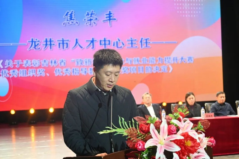 柳森在闭幕式上致辞。他首先代表大赛组委会,向获奖团队和个人表示热烈的祝贺!向所有参赛学生、指导教师和专家评委表示诚挚的问候!向延边州人民政府、吉林省人力资源和社会保障厅、延边州人力资源和社会保障局、龙井市人民政府的大力支持表示诚挚的感谢!