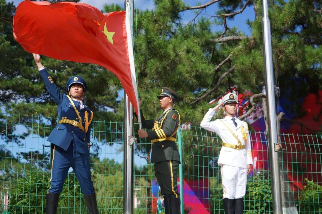 军训动员大会在庄严的升旗仪式中盛大启幕,伴随着雄壮激昂的中华人民共和国国歌,全体师生、教官肃立注目。冉冉升起的耀眼中国红,与校园的蓝天交相辉映,激起了同学们心中炽热的家国情怀与奋斗激情。