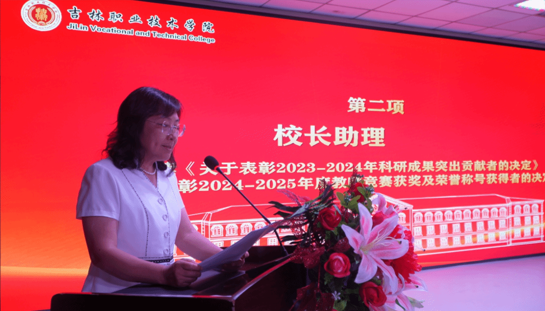 校长助理首先宣读《关于表彰2023—2024年科研成果突出贡献者的决定》与《关于表彰2024-2025年度教师竞赛获奖及荣誉称号获得者的决定》,校党委副书记李可心宣读《关于表彰2024年度先进集体、优秀干部及先进工作者的决定》,校领导为受表彰集体和个人颁奖。