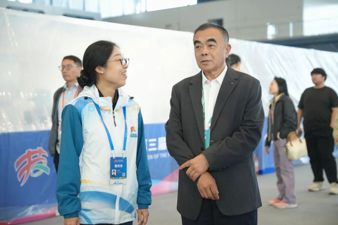 张电达全程专注观摩开幕式,会前,他与“大国工匠”李万君等行业专家深入交流座谈,明确表示“高技能人才是职业教育的核心成果,学校将始终以大赛为标杆,深化教学改革,强化实践教学,为社会培养更多能工巧匠”。