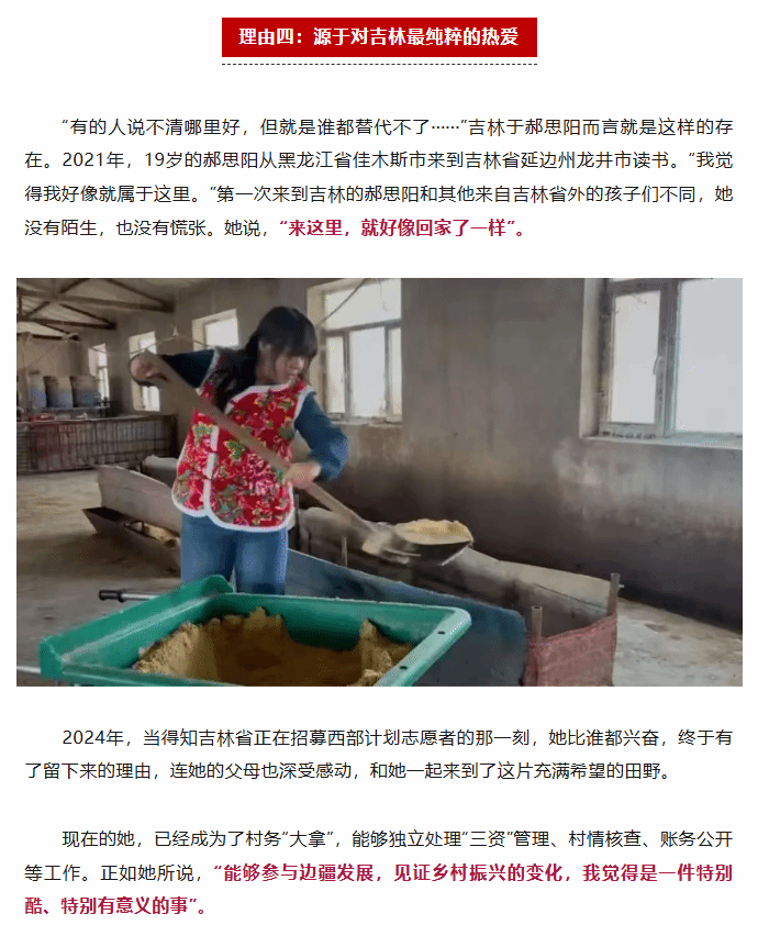 在服务中,郝思阳始终注重文化传承与精神引领。2025 年 1 月,她参与共青团龙井市委 “青春向北戍边富龙” 迎新年文艺汇演,通过歌舞、朗诵等形式传递红色戍边精神;2 月,其父母为支持她扎根边疆,主动加入鹤栖村土众豪家庭小农场,她借此拍摄短视频记录 “一家三口守边疆” 的故事,视频从共青团龙井市委公众号层层传播至延边青年、吉林西部计划公众号,最终被共青团中央转载,引发广泛关注。吉林省副书记吴海英对她的事迹给予肯定,称赞其 “用青春故事诠释了新时代戍边人的家国情怀”,龙井市委更推荐她参选 “先生向北・青春聚集” 吉林百位好青年。