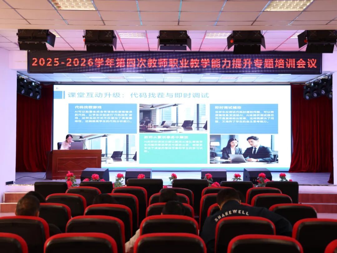 (通讯员 韩黎晓)为深化职业教育教学改革,提升教师核心教学能力,助力课程建设与智慧教学融合发展,11 月 12 日,我校 2025-2026 学年第四次教师职业教育能力提升专题培训会议在行政楼三楼学术报告厅顺利召开。全体无教学任务的任课教师及行政兼课教师参加培训。