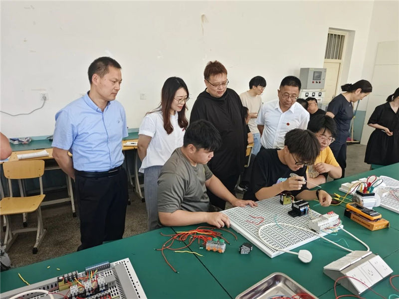 课堂上,陈老师将生产生活实际应用和电机与电气控制实训课程内容相结合,通过实训设备演示讲解控制原理。他根据现有实训器材合理分组,组织同学们实际操作,针对出现的问题进行解答。整堂课教学组织严密有序、寓教于乐,教师语言表达简练清晰、形象生动,实训内容符合培养目标要求,操作示范标准规范。